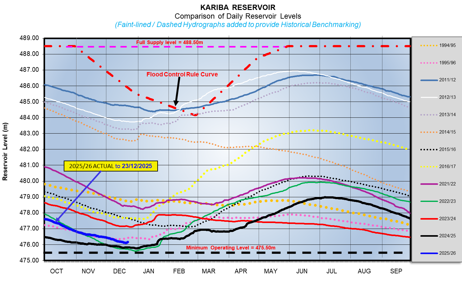 The Kariba Lake is designed to operate between levels 475.50m and 488.50m (with 0.70m freeboard) for hydropower generation.