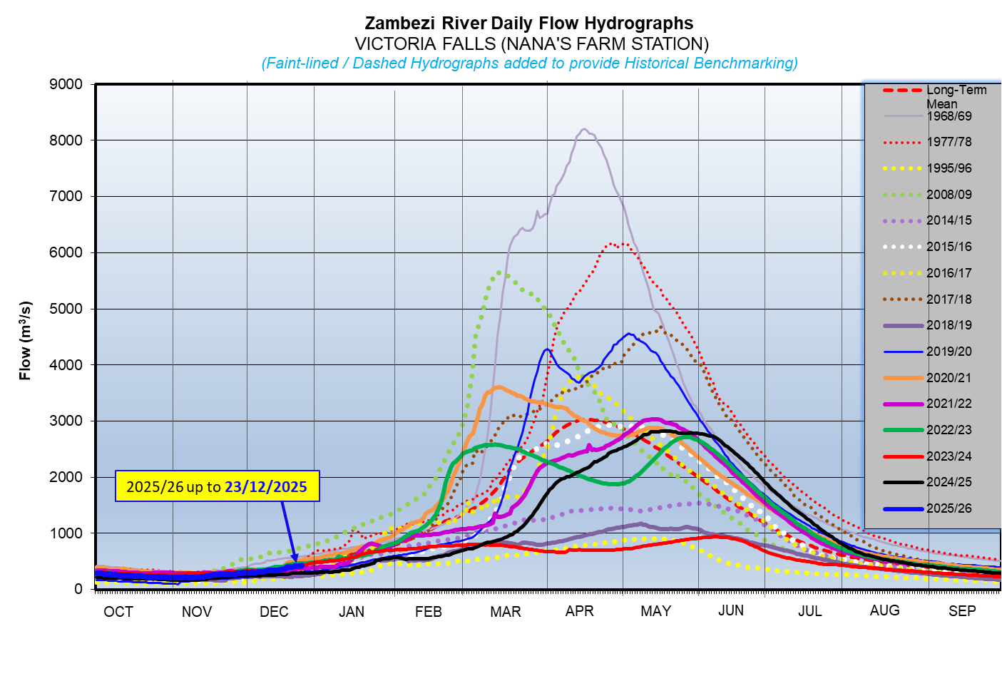 The Zambezi River flows at Victoria Falls – Nana’s Farm Station are steadily rising, closing the period under review at 425m3/s as of 23rd December 2025. The flow observed on the same date last year was lower at 292m3/s.