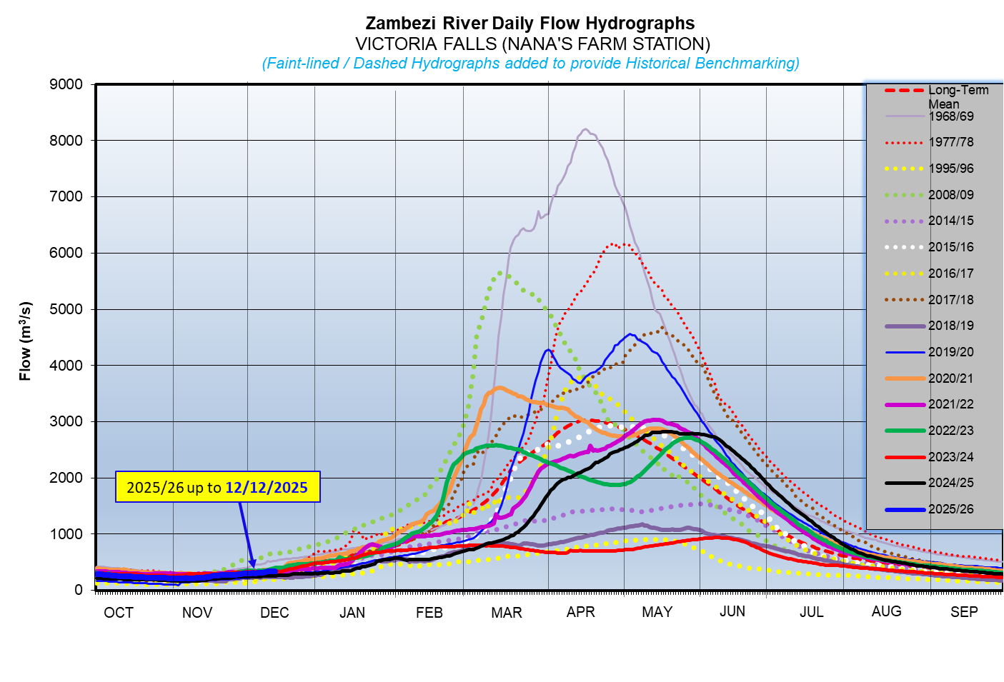 The Zambezi River flows at Victoria Falls – Nana’s Farm Station are steadily rising, closing the period under review at 341m3/s as of 12th December 2025. The flow observed on the same date last year was lower at 262m3/s.